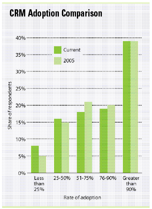 Look at the supposedly “upper” end of the scale: Adoption rates of greater than 75 percent are essentially flat. On the lower end, adoption rates of less than 50 percent have increased overall, from 20 percent to 24 percent. (The bar graph above segments the figures in greater detail.) The real power of CRM will not be realized with this “sort-of” usage. The greater-than-90-percent rates need to become much higher. So what’s hindering them?